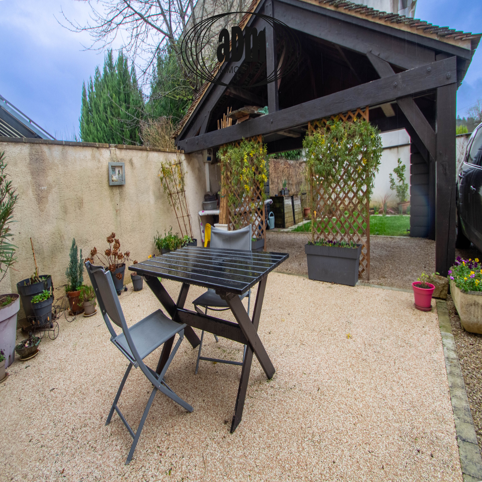 À l’extérieur : Terrasse conviviale, Jardin clos d’environ 365 m², Stationnement pour 2 véhicules, Carport